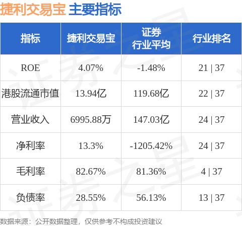 捷利交易宝港股市值13.94亿港元,在证券行业中排名第22。主要指标见下表: