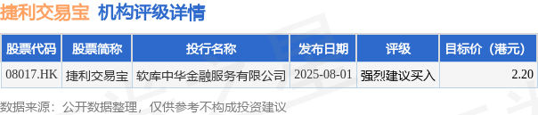 截至2025年10月10日收盘,捷利交易宝(08017.HK)报收于1.91港元,下跌6.83%,成交量506.0万股,成交额993.14万港元。投行对该股的评级以强烈建议买入为主,近90天内共有1家投行给出强烈建议买入评级,近90天的目标均价为2.2港元。软库中华金融服务有限公司最新一份研报给予捷利交易宝强烈建议买入评级,目标价2.2港元。