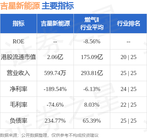 吉星新能源港股市值2.06亿港元,在燃气Ⅱ行业中排名第20。主要指标见下表:
