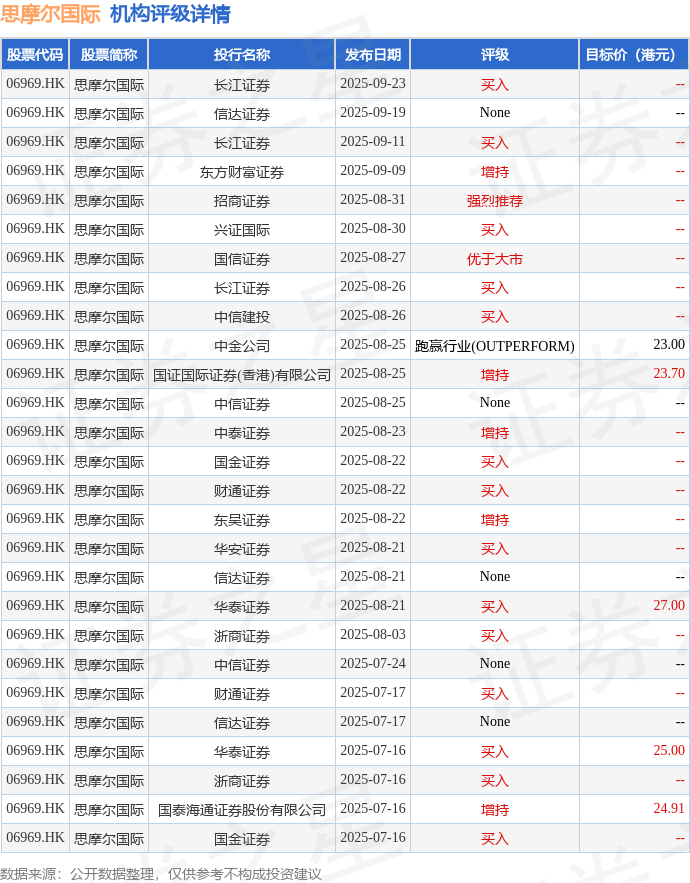 投行对该股的评级以买入为主,近90天内共有14家投行给出买入评级,近90天的目标均价为24.72港元。长江证券最新一份研报给予思摩尔国际买入评级。