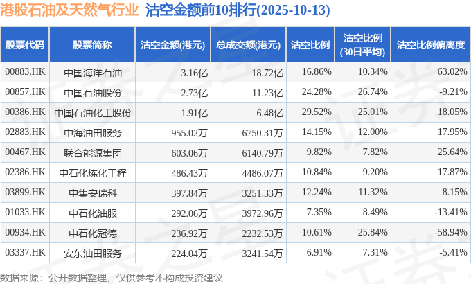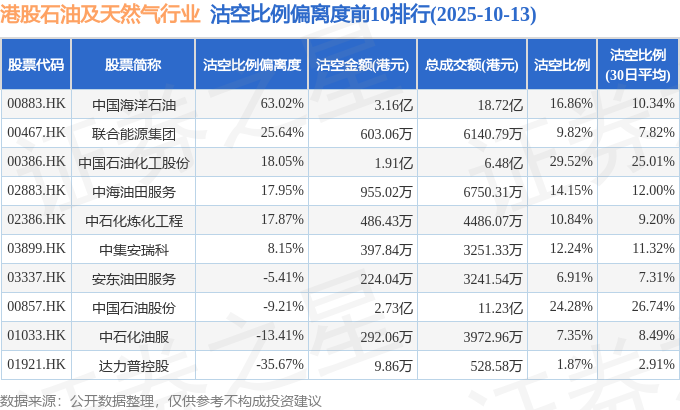 从沽空比例偏离度来看,中国海洋石油、联合能源集团、中国石油化工股份沽空比例偏离度位居行业前三,分别为63.02%、25.64%、18.05%。