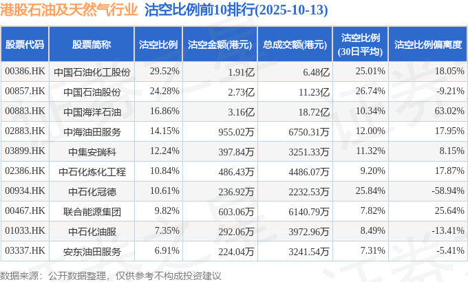 从沽空金额来看,中国海洋石油、中国石油股份、中国石油化工股份沽空金额位居行业前三,分别为3.16亿港元、2.73亿港元、1.91亿港元。