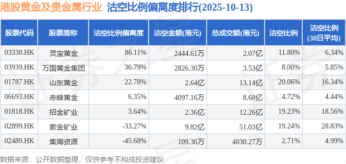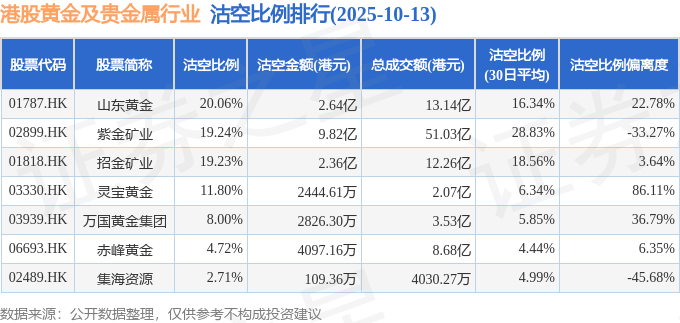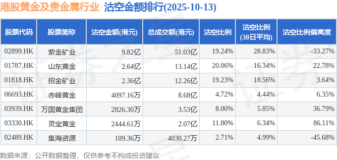 从沽空金额来看,紫金矿业、山东黄金、招金矿业沽空金额位居行业前三,分别为9.82亿港元、2.64亿港元、2.36亿港元。