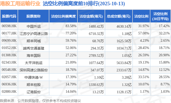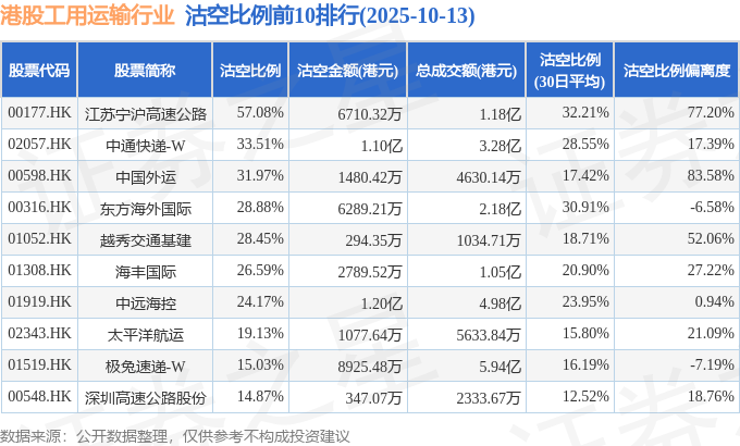 从沽空比例来看,江苏宁沪高速公路、中通快递-W、中国外运沽空比例位居行业前三,分别为57.08%、33.51%、31.97%。
