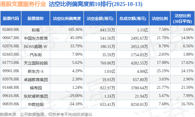 从沽空比例偏离度来看,粉笔、中国东方教育、BOSS直聘-W沽空比例偏离度位居行业前三,分别为105.36%、45.1%、33.79%。