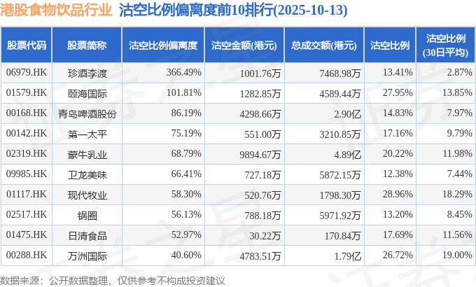 从沽空比例偏离度来看,珍酒李渡、颐海国际、青岛啤酒股份沽空比例偏离度位居行业前三,分别为366.49%、101.81%、86.19%。