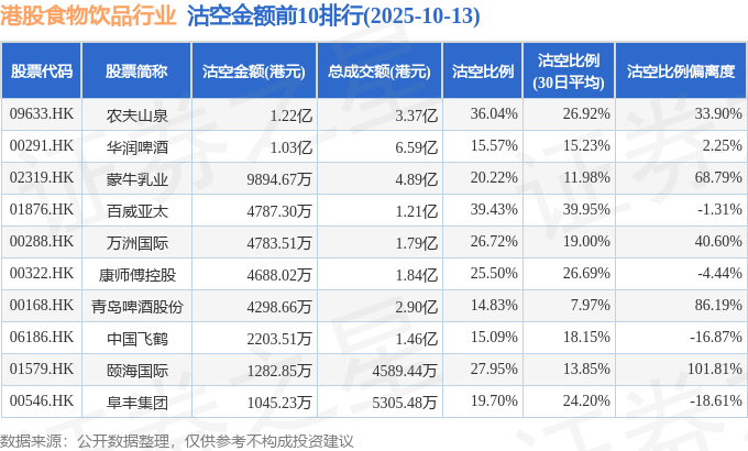 从沽空金额来看,农夫山泉、华润啤酒、蒙牛乳业沽空金额位居行业前三,分别为1.22亿港元、1.03亿港元、9894.67万港元。