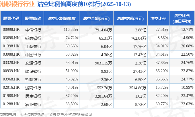 从沽空比例偏离度来看,中信银行、徽商银行、工商银行沽空比例偏离度位居行业前三,分别为116.38%、74.72%、69.36%。