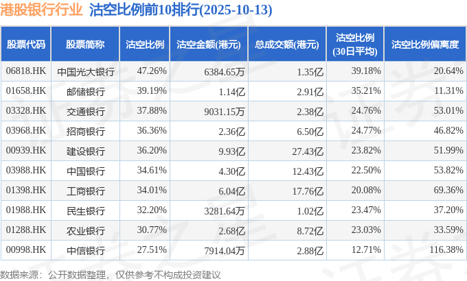 从沽空比例来看,中国光大银行、邮储银行、交通银行沽空比例位居行业前三,分别为47.26%、39.19%、37.88%。