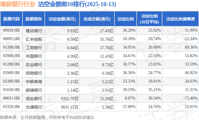 从沽空金额来看,建设银行、汇丰控股、工商银行沽空金额位居行业前三,分别为9.93亿港元、6.5亿港元、6.04亿港元。