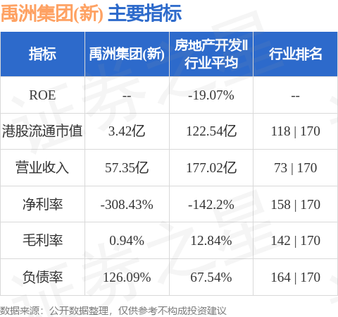 禹洲集团(新)港股市值3.42亿港元,在房地产开发Ⅱ行业中排名第118。主要指标见下表: