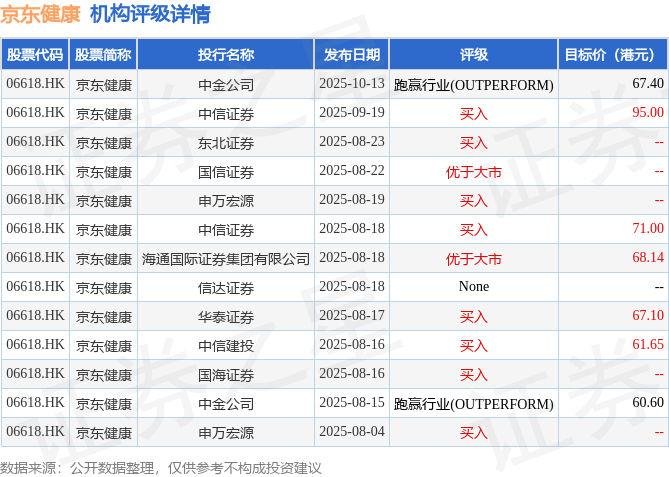 投行对该股的评级以买入为主,近90天内共有8家投行给出买入评级,近90天的目标均价为70.13港元。中金公司最新一份研报给予京东健康跑赢行业(OUTPERFORM)评级,目标价67.4港元。
