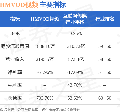 HMVOD视频港股市值1838.16万港元,在互联网传媒行业中排名第59。主要指标见下表: