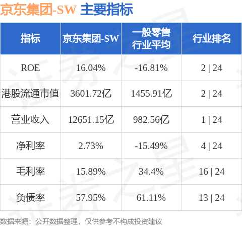 京东集团-SW港股市值3601.72亿港元,在一般零售行业中排名第2。主要指标见下表: