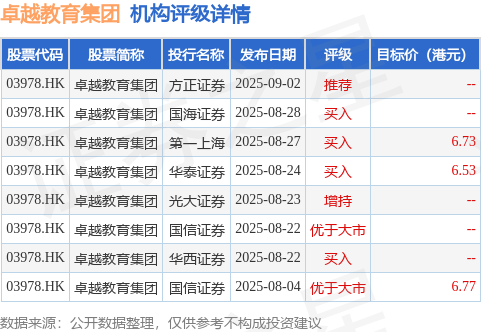 截至2025年10月14日收盘,卓越教育集团(03978.HK)报收于4.81港元,下跌3.99%,成交量420.67万股,成交额2014.55万港元。投行对该股的评级以买入为主,近90天内共有4家投行给出买入评级,近90天的目标均价为6.68港元。方正证券最新一份研报给予卓越教育集团推荐评级。