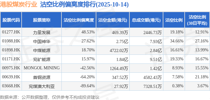从沽空比例偏离度来看,力量发展、中国神华、中煤能源沽空比例偏离度位居行业前三,分别为48.53%、27.62%、18.7%。