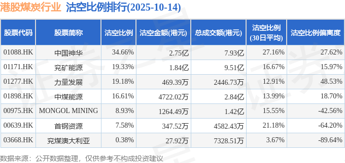 证券之星消息,10月14日港交所披露数据显示,当日港股煤炭行业的22只个股中有7只被沽空,总沽空股数为3421.81万股,总沽空金额为5.27亿元(港元),而当日煤炭行业的总成交金额为23.33亿元(港元),沽空比例为22.6%。当日煤炭行业总体涨0.25%。