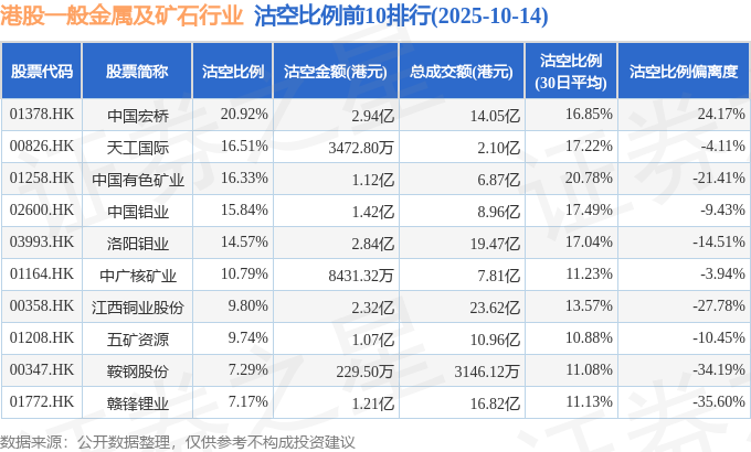 从沽空比例偏离度来看,力勤资源、中国宏桥、中广核矿业沽空比例偏离度位居行业前三,分别为37.33%、24.17%、-3.94%。