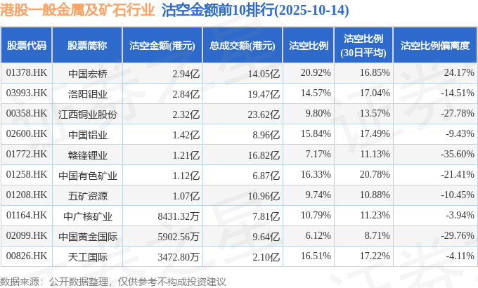 从沽空金额来看,中国宏桥、洛阳钼业、江西铜业股份沽空金额位居行业前三,分别为2.94亿港元、2.84亿港元、2.32亿港元。