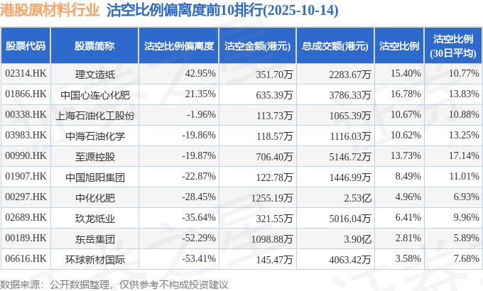 从沽空比例来看,中国心连心化肥、理文造纸、至源控股沽空比例位居行业前三,分别为16.78%、15.4%、13.73%。
