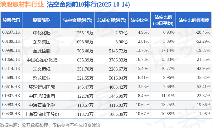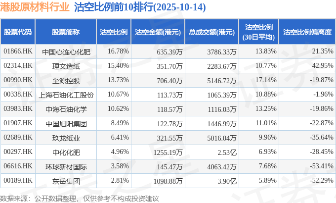 从沽空比例偏离度来看,理文造纸、中国心连心化肥、上海石油化工股份沽空比例偏离度位居行业前三,分别为42.95%、21.35%、-1.96%。
