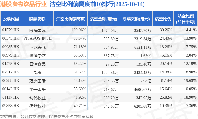 从沽空比例偏离度来看,颐海国际、VITASOY INT'L、卫龙美味沽空比例偏离度位居行业前三,分别为109.96%、75.54%、71.18%。
