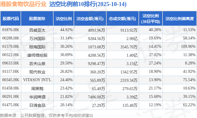 从沽空比例来看,百威亚太、万洲国际、颐海国际沽空比例位居行业前三,分别为44.92%、31.14%、30.26%。