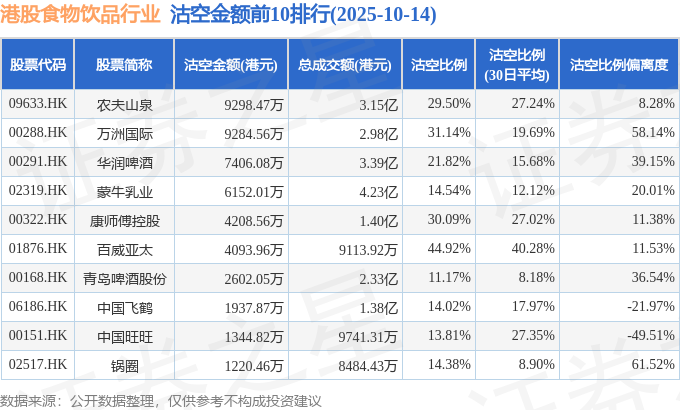 从沽空金额来看,农夫山泉、万洲国际、华润啤酒沽空金额位居行业前三,分别为9298.47万港元、9284.56万港元、7406.08万港元。