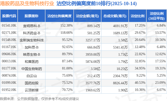 从沽空比例偏离度来看,宜明昂科-B、科济药业-B、金斯瑞生物科技沽空比例偏离度位居行业前三,分别为152.38%、118.66%、95.52%。