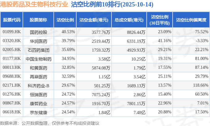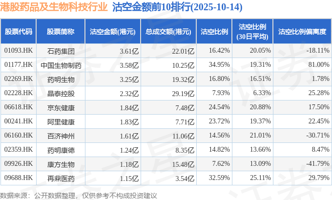 从沽空金额来看,石药集团、中国生物制药、药明生物沽空金额位居行业前三,分别为3.61亿港元、3.58亿港元、3.25亿港元。
