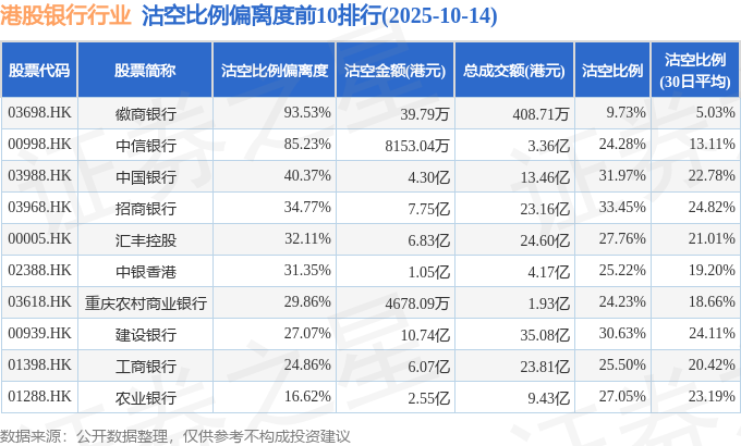 从沽空比例偏离度来看,徽商银行、中信银行、中国银行沽空比例偏离度位居行业前三,分别为93.53%、85.23%、40.37%。