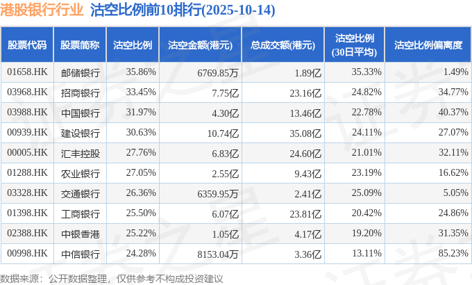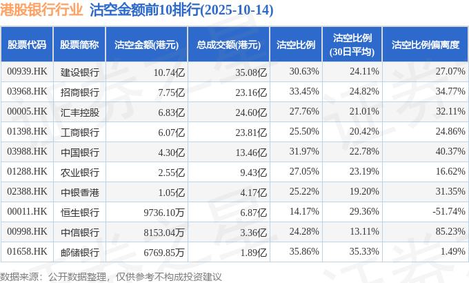 从沽空金额来看,建设银行、招商银行、汇丰控股沽空金额位居行业前三,分别为10.74亿港元、7.75亿港元、6.83亿港元。
