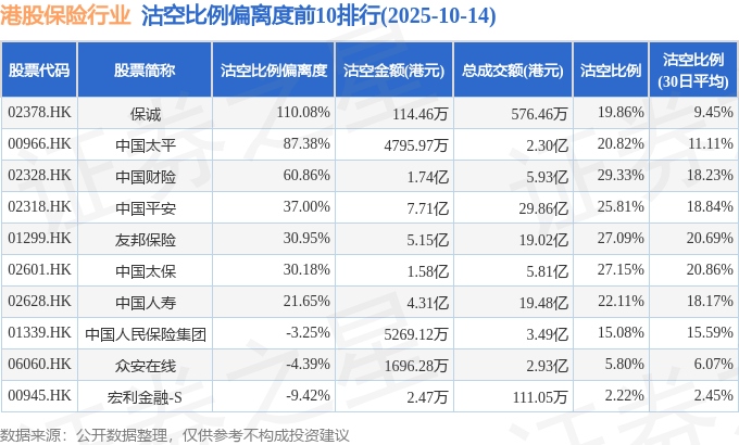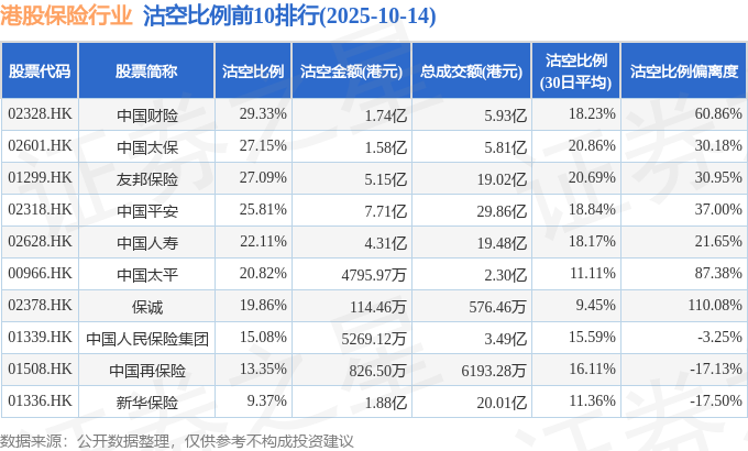 从沽空比例偏离度来看,保诚、中国太平、中国财险沽空比例偏离度位居行业前三,分别为110.08%、87.38%、60.86%。