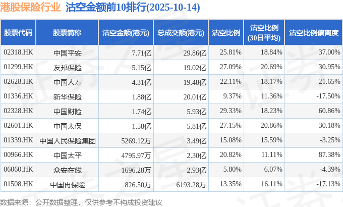 从沽空金额来看,中国平安、友邦保险、中国人寿沽空金额位居行业前三,分别为7.71亿港元、5.15亿港元、4.31亿港元。