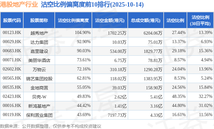 从沽空比例偏离度来看,越秀地产、达力集团、嘉里建设沽空比例偏离度位居行业前三,分别为104.9%、92.9%、90.03%。
