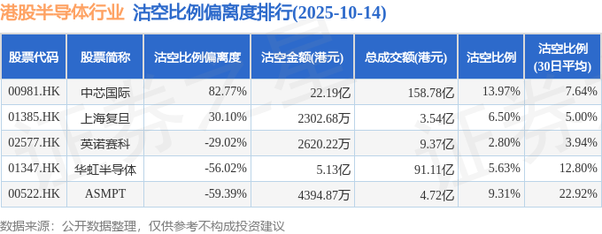 证券之星消息,10月14日港交所披露数据显示,当日港股半导体行业的24只个股中有5只被沽空,总沽空股数为3668.53万股,总沽空金额为28.25亿元(港元),而当日半导体行业的总成交金额为270.18亿元(港元),沽空比例为10.45%。当日半导体行业总体跌8.26%。
