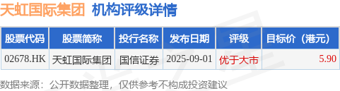 截至2025年10月14日收盘,天虹国际集团(02678.HK)报收于4.53港元,上涨0.67%,成交量43.5万股,成交额197.02万港元。投行对该股的评级以优于大市为主,近90天内共有1家投行给出优于大市评级,近90天的目标均价为5.9港元。国信证券最新一份研报给予天虹国际集团优于大市评级,目标价5.9港元。