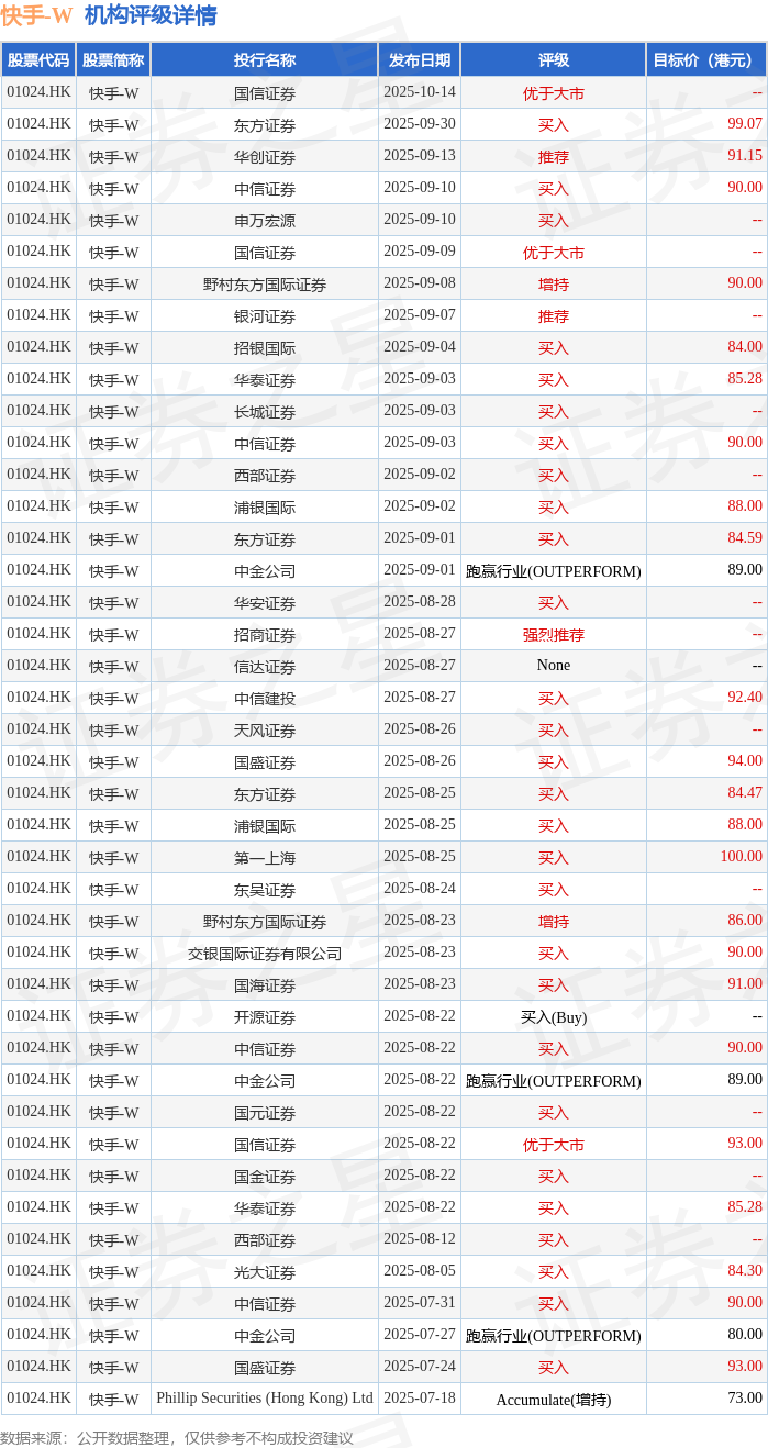 截至2025年10月14日收盘,快手-W(01024.HK)报收于75.0港元,下跌6.77%,成交量7438.13万股,成交额57.23亿港元。投行对该股的评级以买入为主,近90天内共有28家投行给出买入评级,近90天的目标均价为88.69港元。国信证券最新一份研报给予快手-W优于大市评级。