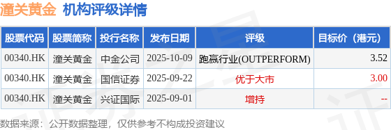 投行对该股的评级以跑赢行业(OUTPERFORM)为主,近90天内共有1家投行给出跑赢行业(OUTPERFORM)评级,近90天的目标均价为3.26港元。中金公司最新一份研报给予潼关黄金跑赢行业(OUTPERFORM)评级,目标价3.52港元。