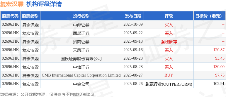 投行对该股的评级以买入为主,近90天内共有5家投行给出买入评级,近90天的目标均价为109港元。中邮证券最新一份研报给予复宏汉霖买入评级。