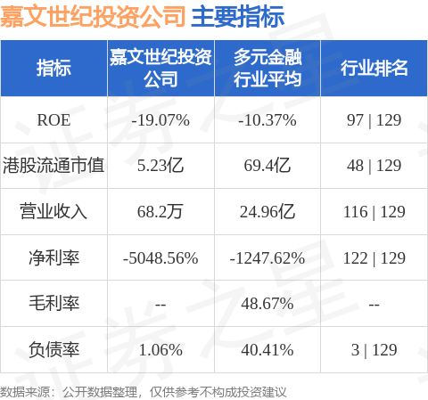 嘉文世纪投资公司港股市值5.23亿港元,在多元金融行业中排名第48。主要指标见下表: