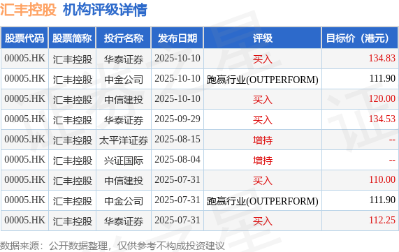 截至2025年10月15日收盘,汇丰控股(00005.HK)报收于103.5港元,上涨1.57%,成交量1634.02万股,成交额16.91亿港元。投行对该股的评级以买入为主,近90天内共有5家投行给出买入评级,近90天的目标均价为119.34港元。华泰证券最新一份研报给予汇丰控股买入评级,目标价134.83港元。