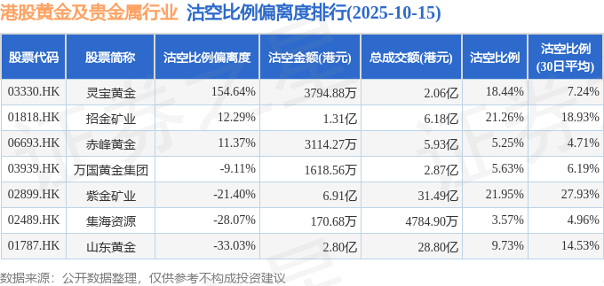 从沽空比例偏离度来看,灵宝黄金、招金矿业、赤峰黄金沽空比例偏离度位居行业前三,分别为154.64%、12.29%、11.37%。