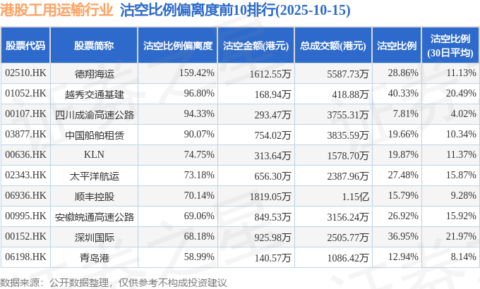 从沽空比例偏离度来看,德翔海运、越秀交通基建、四川成渝高速公路沽空比例偏离度位居行业前三,分别为159.42%、96.8%、94.33%。