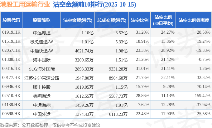 从沽空金额来看,中远海控、极兔速递-W、中通快递-W沽空金额位居行业前三,分别为1.1亿港元、1.01亿港元、4621.74万港元。