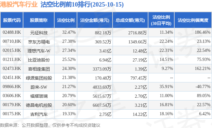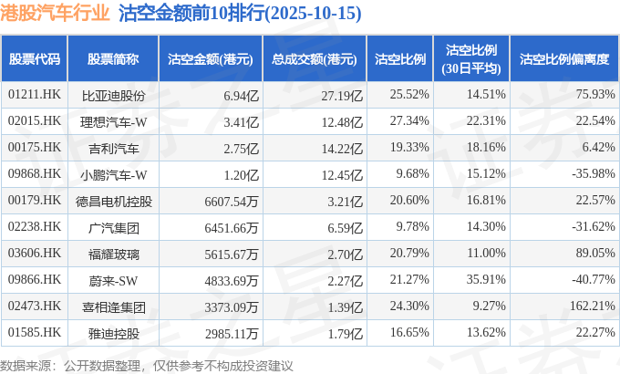 从沽空金额来看,比亚迪股份、理想汽车-W、吉利汽车沽空金额位居行业前三,分别为6.94亿港元、3.41亿港元、2.75亿港元。