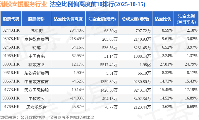 从沽空金额来看,新东方-S、天立国际控股、中国东方教育沽空金额位居行业前三,分别为5517.42万港元、1428.3万港元、1359.39万港元。
