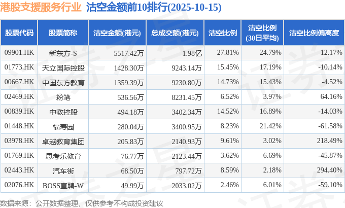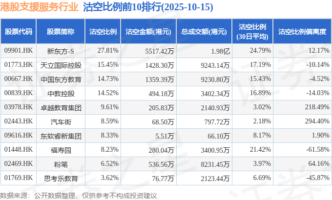 从沽空比例来看,新东方-S、天立国际控股、中国东方教育沽空比例位居行业前三,分别为27.81%、15.45%、14.73%。