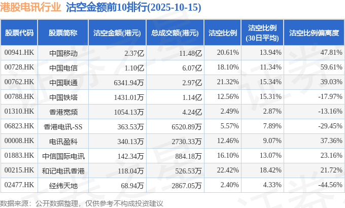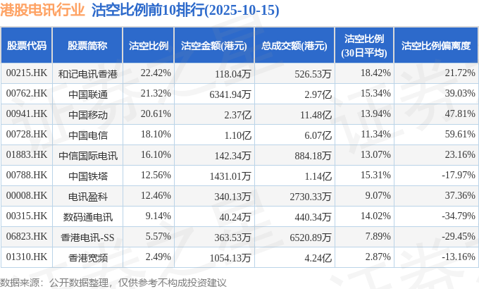 从沽空比例来看,和记电讯香港、中国联通、中国移动沽空比例位居行业前三,分别为22.42%、21.32%、20.61%。