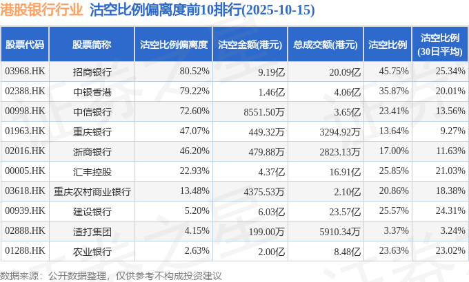 从沽空比例偏离度来看,招商银行、中银香港、中信银行沽空比例偏离度位居行业前三,分别为80.52%、79.22%、72.6%。